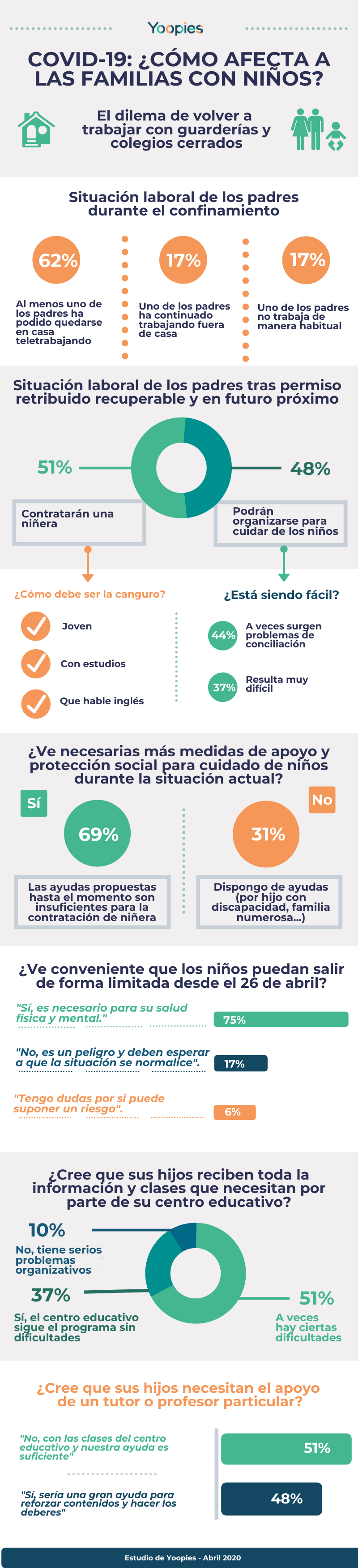 La crisis del COVID-19 pone en dificultades a muchas familias con niños que reanudan su trabajo con guarderías y colegios cerrados posiblemente hasta septiembre. Los campamentos de verano están en el aire y los abuelos «encerrados». Yoopies, una plataforma de servicios de cuidado infantil y asistencia a familias, ha preguntado a los padres cómo afrontan la situación. Los datos arrojados muestran que, durante lo que llevamos de confinamiento, en el 62% de los hogares analizados al menos uno de los padres ha podido quedarse en casa teletrabajando y así cuidar a sus hijos. En el resto de familias, uno de los padres ha continuado trabajando fuera de casa o uno de ellos no trabaja de manera habitual (17% respectivamente). Solo en el 3% de los casos ninguno trabaja.